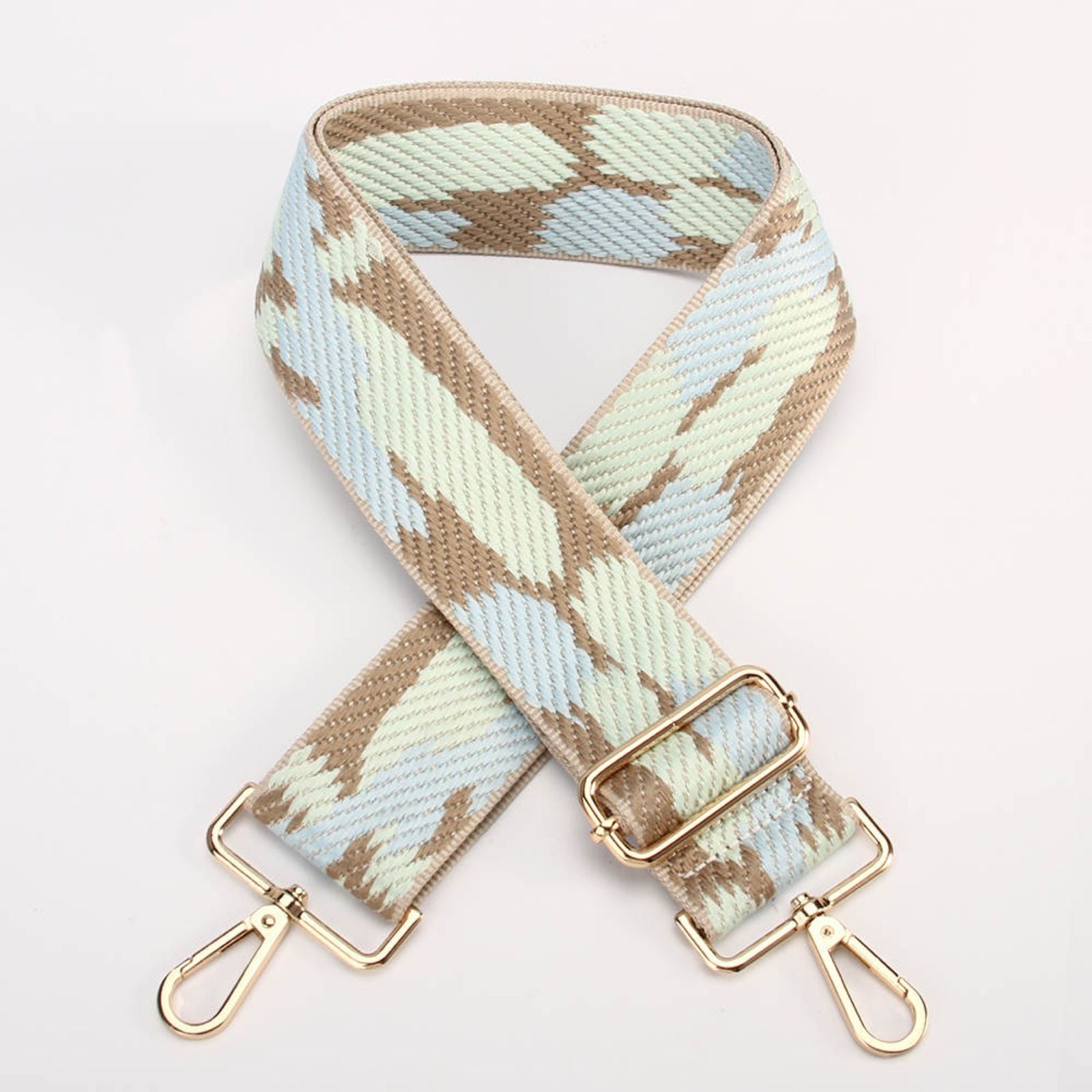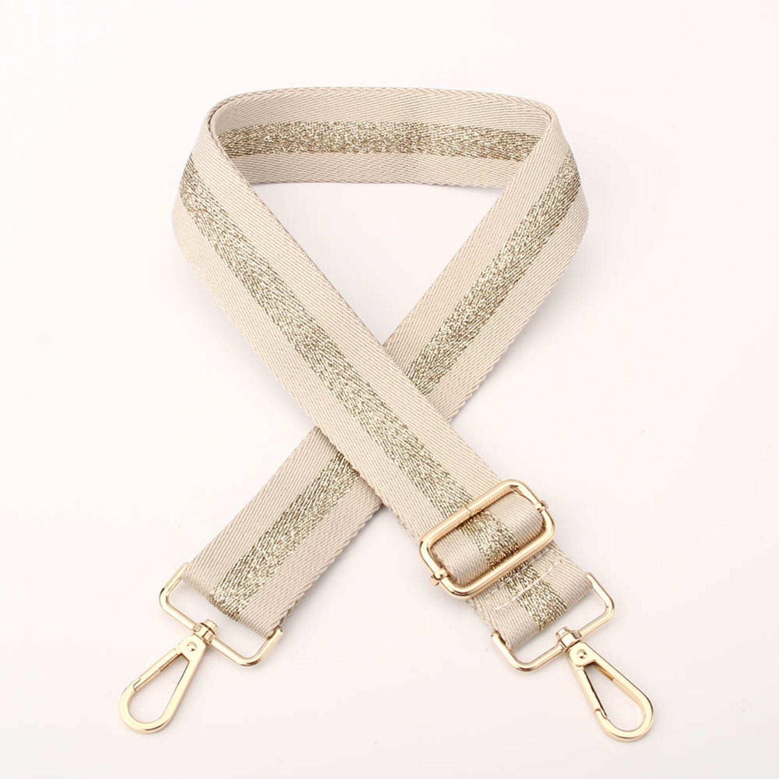 - Material straps with gold clip detail